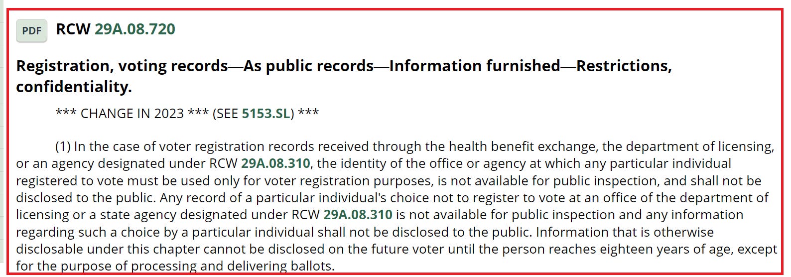 This law specifically excludes any disclosure of voter records and registrations performed by the Department of Licensing (DoL), and any state agency (which would include: Department of Social and Human Services (DSHS), Department of Children, Youth, and Family Services (DCYFS), Department of Corrections (DoC), and any other agency that registers people to vote. The latest inclusion also excludes so-called ‘pre-registration of potential voters under the age of 18’.
